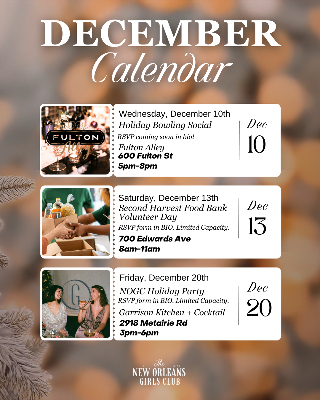 Welcome to the New Orleans Girls Club, where each month we bring together women from all walks of life to connect, grow, and have a great time! Our monthly events are designed to foster meaningful connections in a relaxed, supportive atmosphere—whether you're looking to meet new friends, expand your network, or just have a fun night out. From social mixers and networking nights to skill-building workshops and charity events, there’s always something to look forward to.